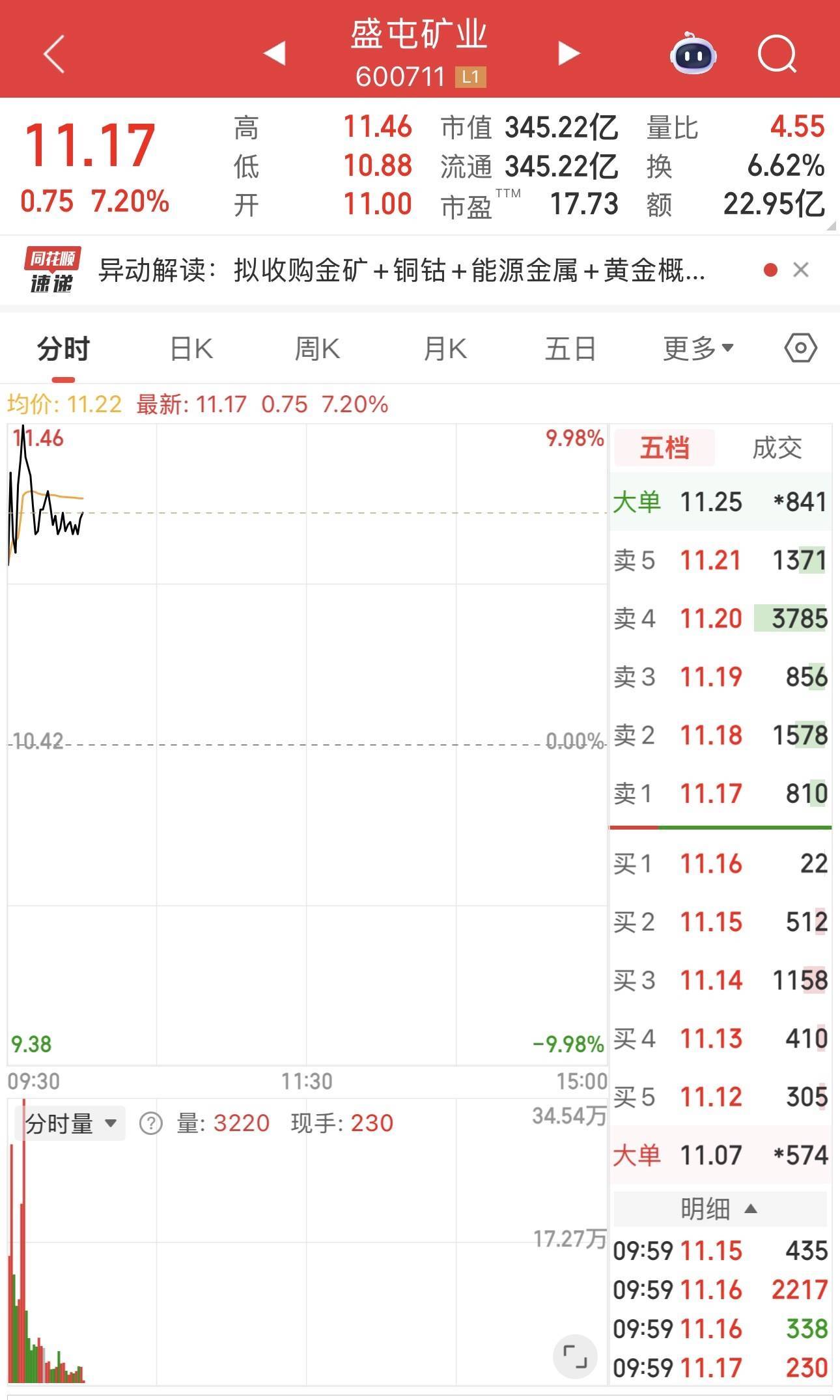 10月15日,盛屯矿业开盘即一路上攻,仅用5分钟便触及涨停,成交额迅速放大至16亿元。截至记者发稿,盛屯矿业价格虽有回落,但仍大涨超7%。而带动股价飙升的,是一份“买矿”的重磅公告。